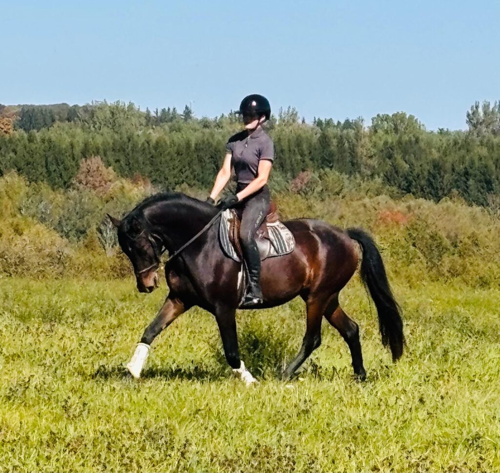 Proven dressage lines. Natural balance and cadence. Big floating trot, active and correct walk and canter. Sensible and kind, inquisitive and friendly.